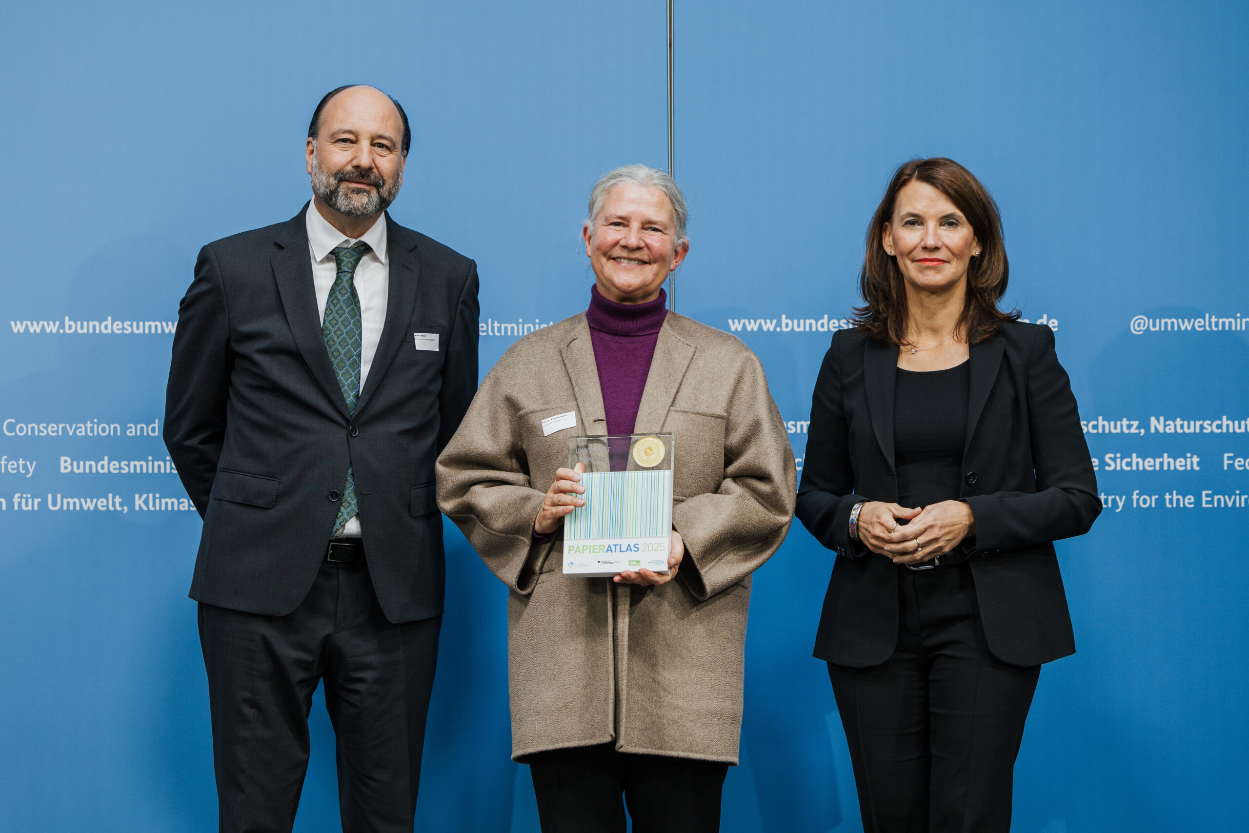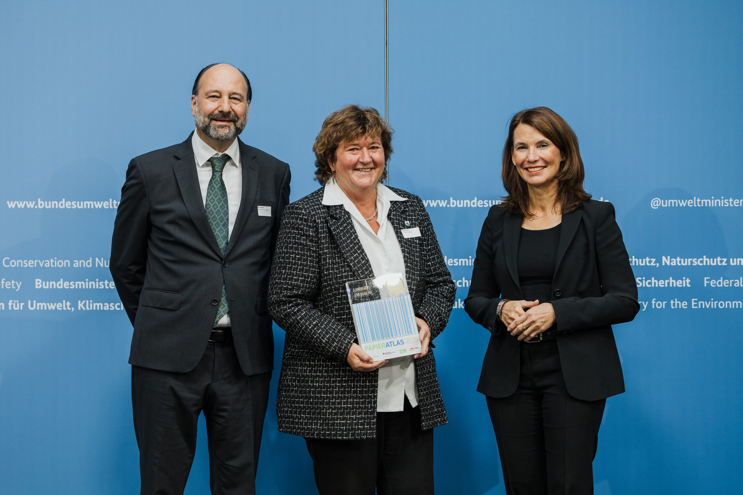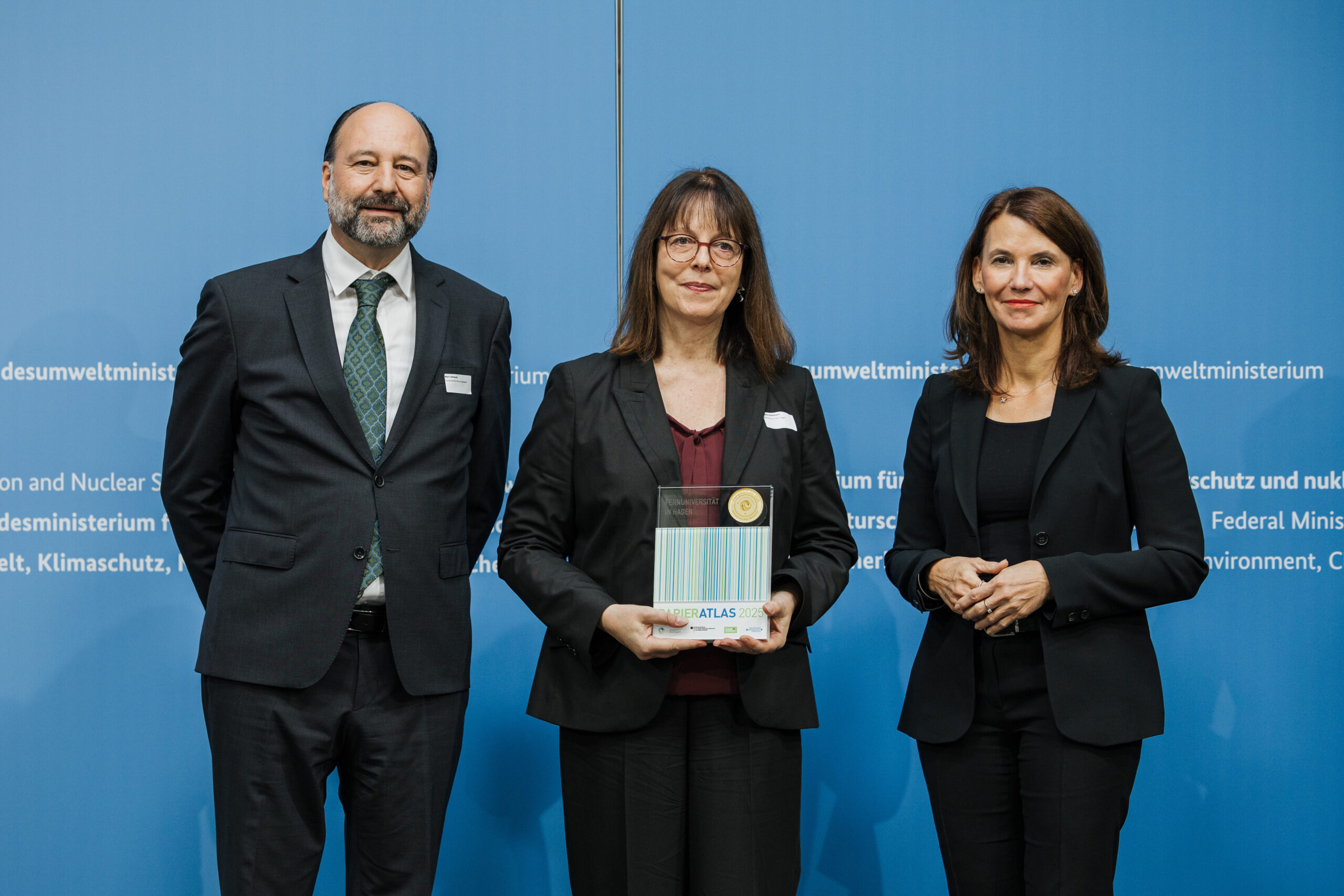 Auszeichnung des Landkreises Ebersberg als „Mehrfachsieger“, v.l.n.r.: Marc Gebauer (Sprecher der Initiative Pro Recyclingpapier), Brigitte Keller (Abteilungsleiterin des Landkreises Ebersberg), Parlamentarische Staatssekretärin Rita Schwarzelühr-Sutter © BMUKN/Sascha Hilgers