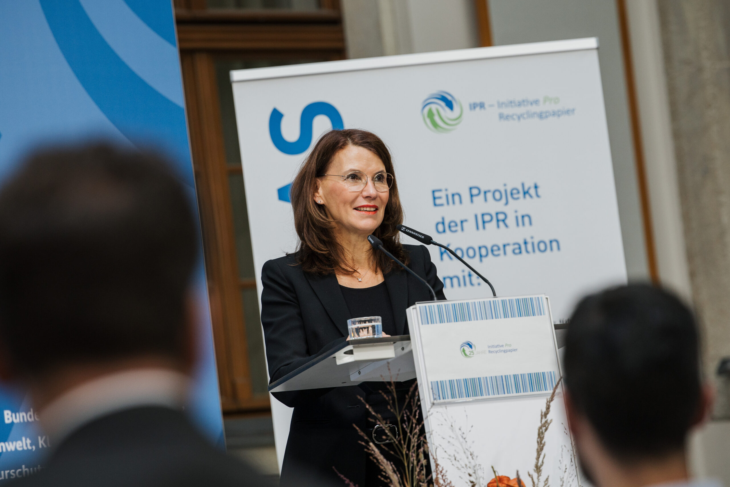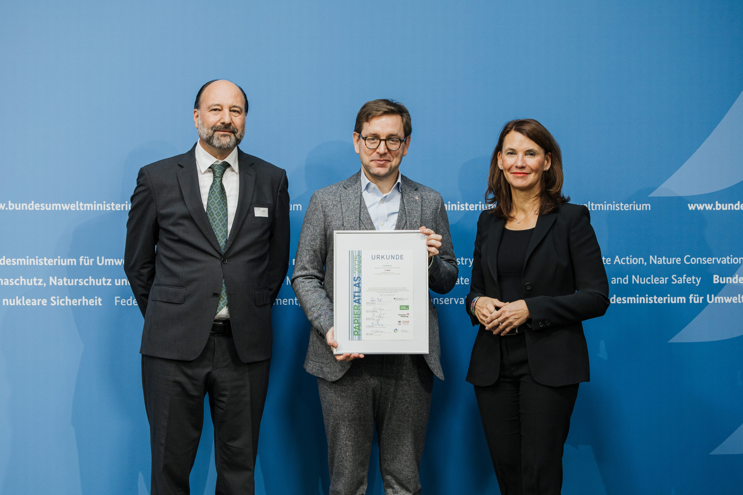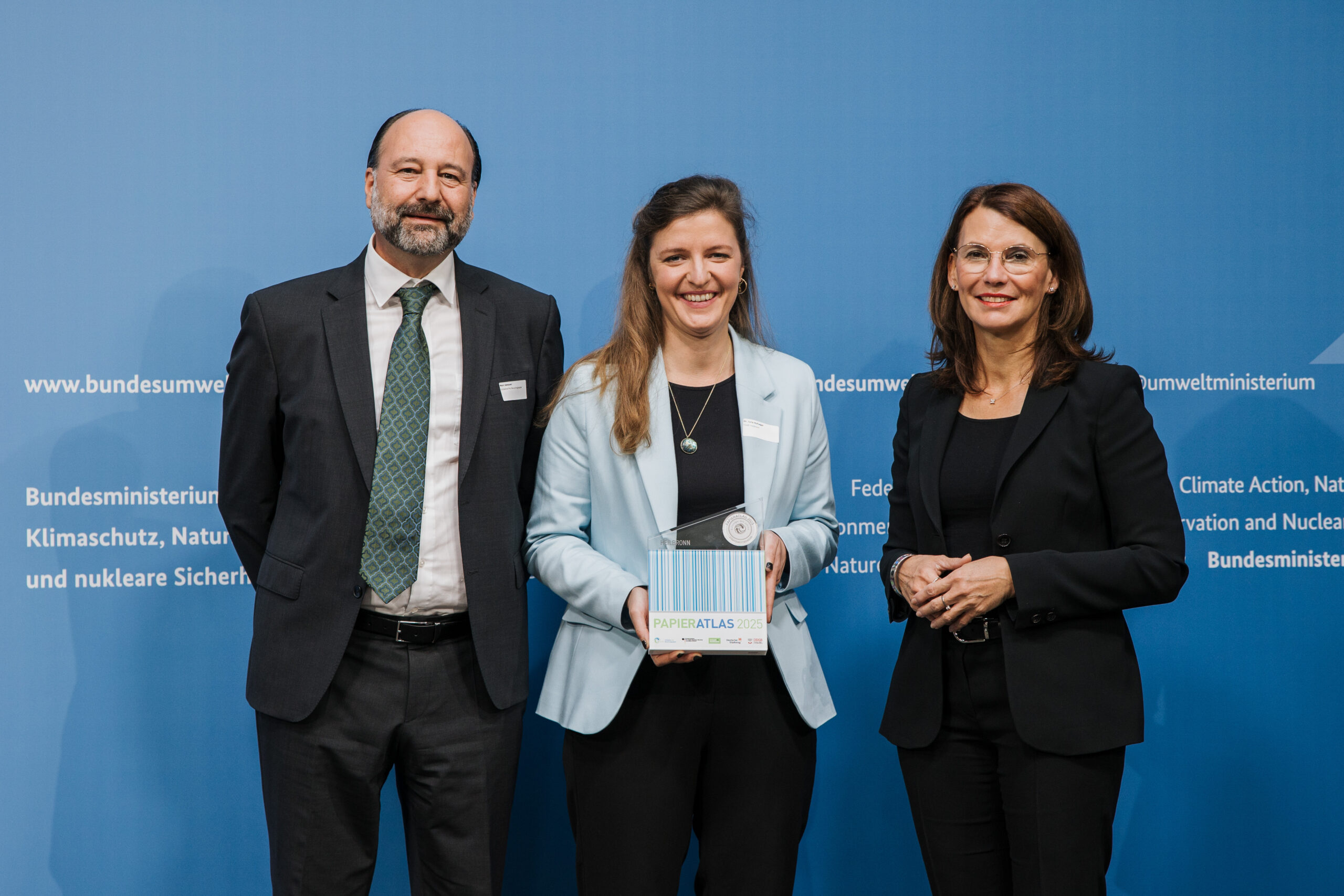 Auszeichnung des Landkreises Ebersberg als „Mehrfachsieger“, v.l.n.r.: Marc Gebauer (Sprecher der Initiative Pro Recyclingpapier), Brigitte Keller (Abteilungsleiterin des Landkreises Ebersberg), Parlamentarische Staatssekretärin Rita Schwarzelühr-Sutter © BMUKN/Sascha Hilgers