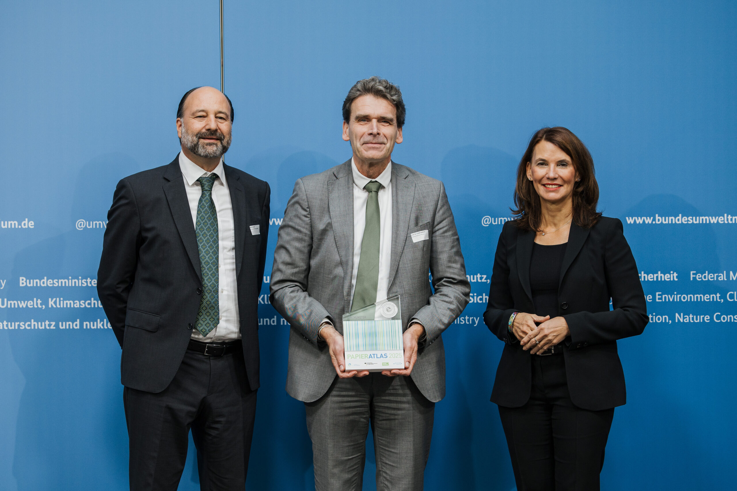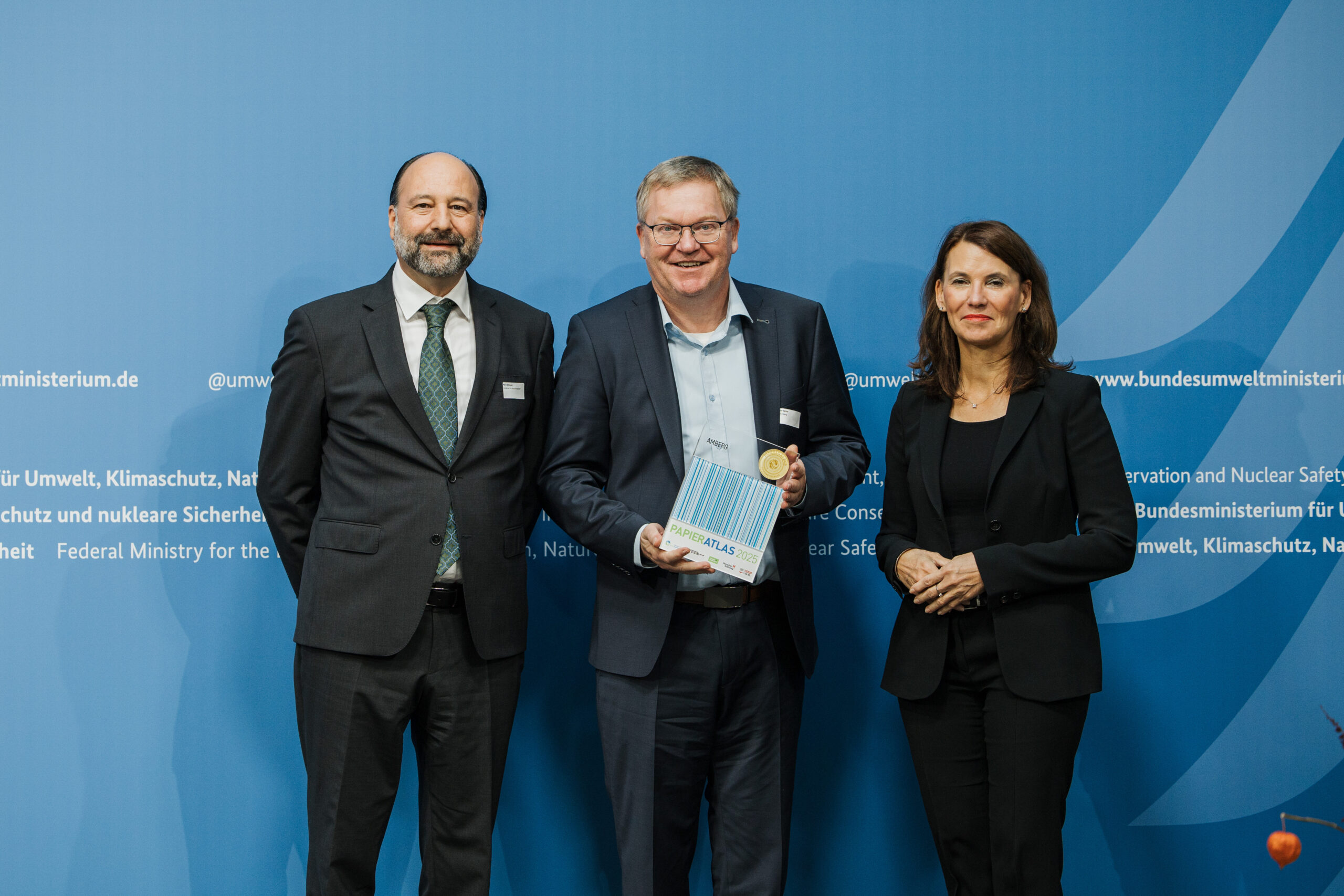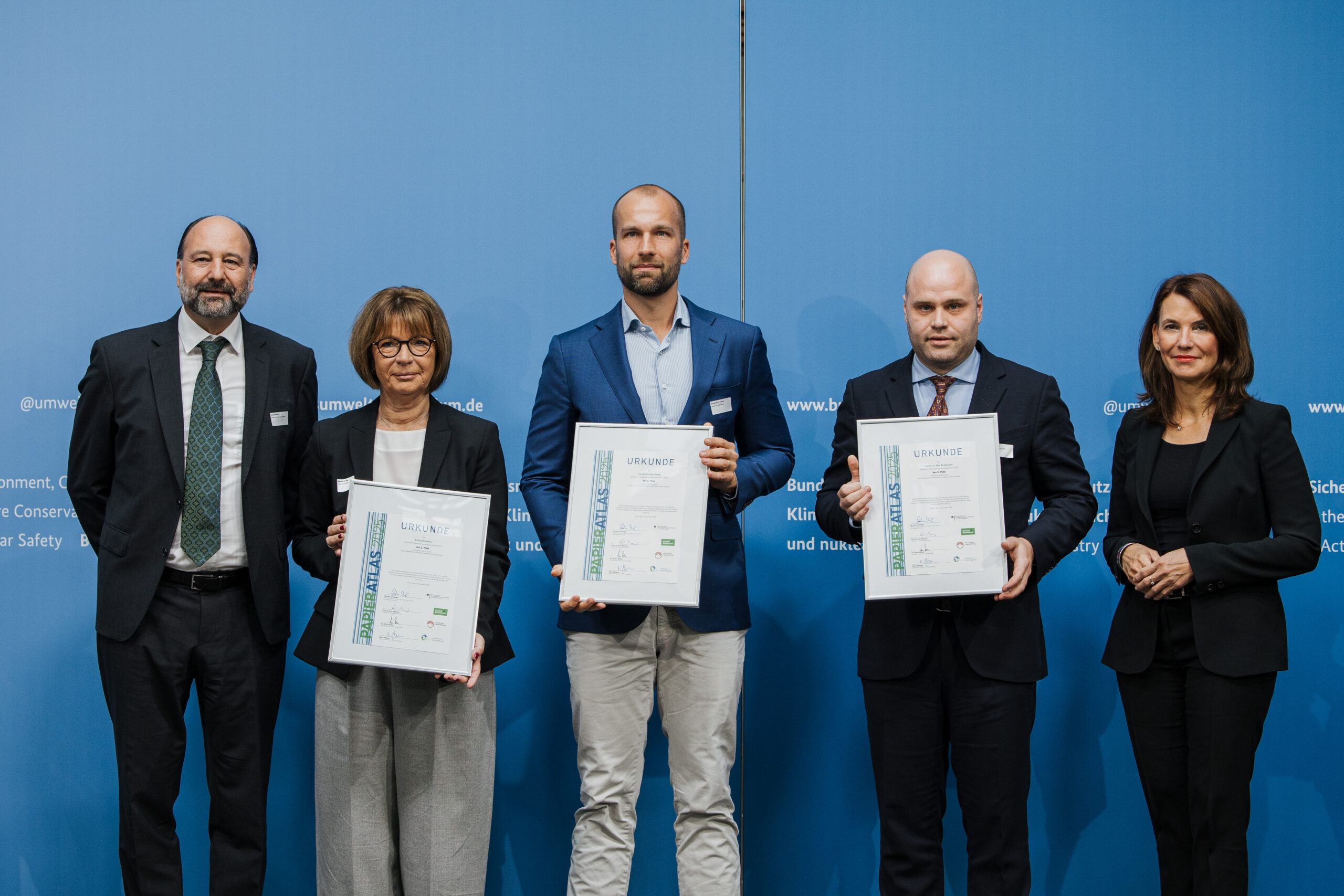 Die Gewinner des Papieratlas 2025 mit Parlamentarischer Staatssekretärin Rita Schwarzelühr-Sutter, Umweltbundesamt-Präsident Prof. Dr. Dirk Messner und IPR-Sprecher Marc Gebauer © BMUKN/Sascha Hilgers
