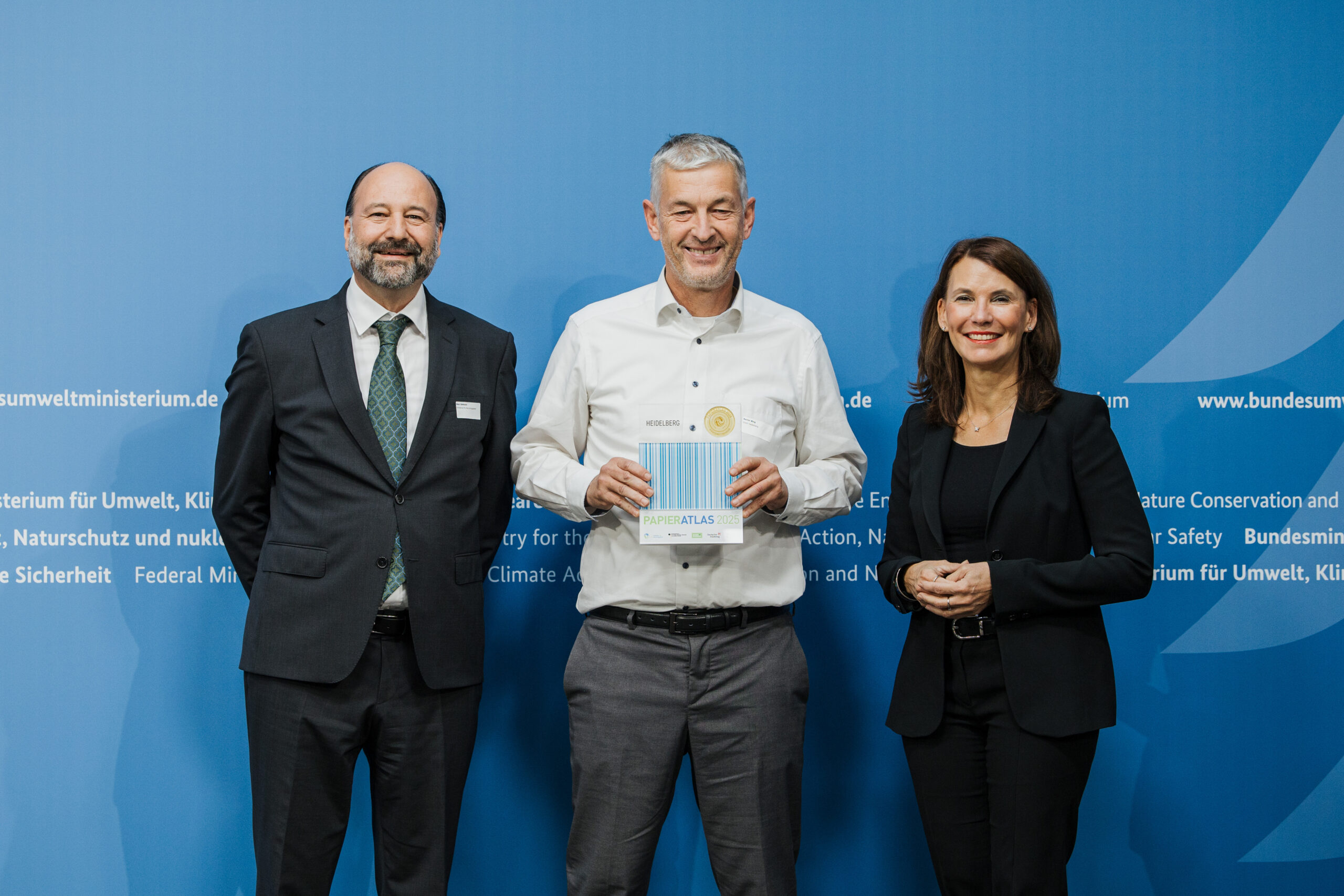 Auszeichnung der Stadt Heidelberg als „Recyclingpapierfreundlichste Stadt“ 2025, v.l.n.r.: Marc Gebauer (Sprecher der Initiative Pro Recyclingpapier), Rainer Bing (Amtsleiter Digitales und Informationsverarbeitung der Stadt Heidelberg), Parlamentarische Staatssekretärin Rita Schwarzelühr-Sutter © BMUKN/Sascha Hilgers