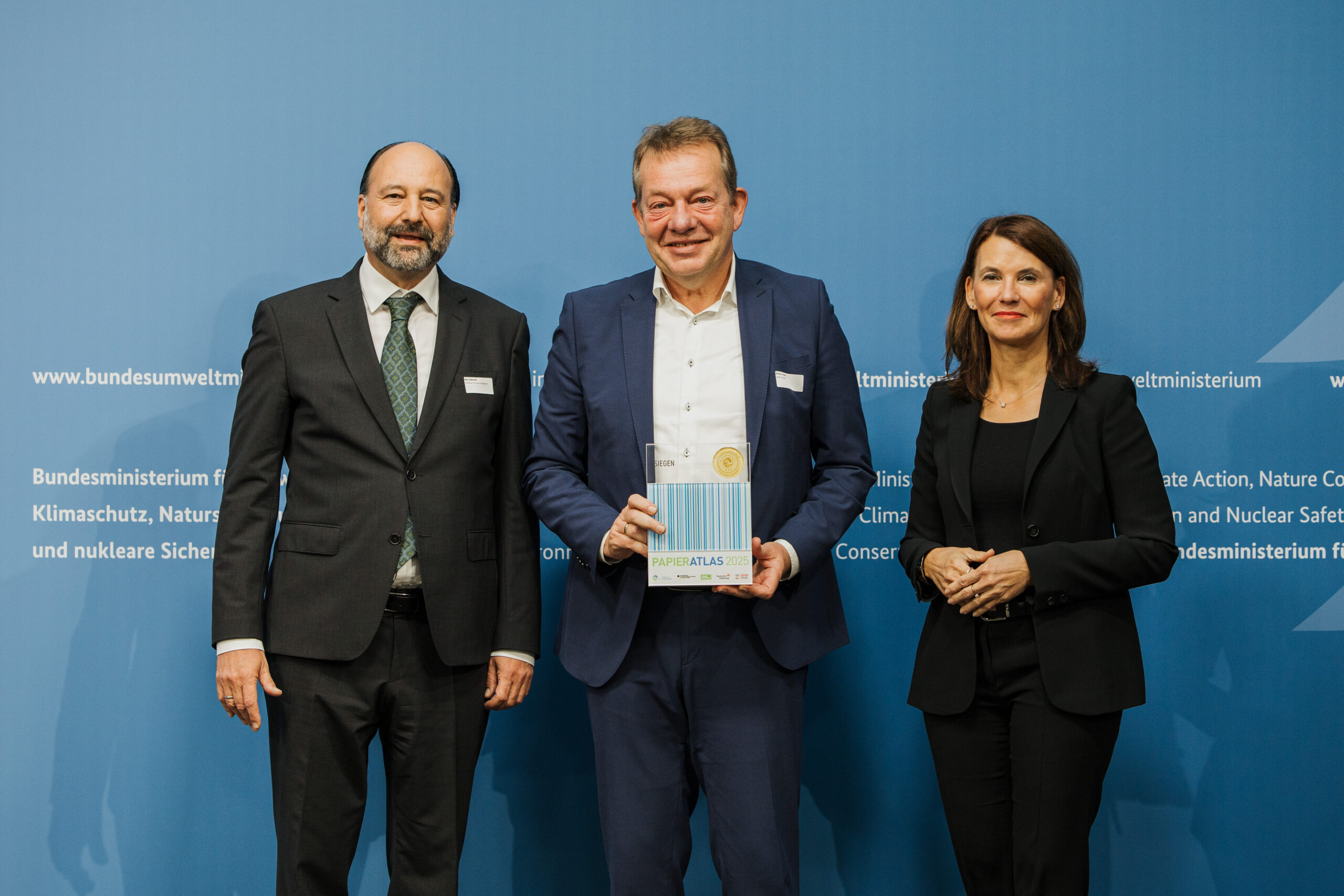 Auszeichnung der Stadt Siegen als „Mehrfachsieger“, v.l.n.r.: Marc Gebauer (Sprecher der Initiative Pro Recyclingpapier), Steffen Mues (bis 31.10.2025 Bürgermeister der Stadt Siegen), Parlamentarische Staatssekretärin Rita Schwarzelühr-Sutter © BMUKN/Sascha Hilgers