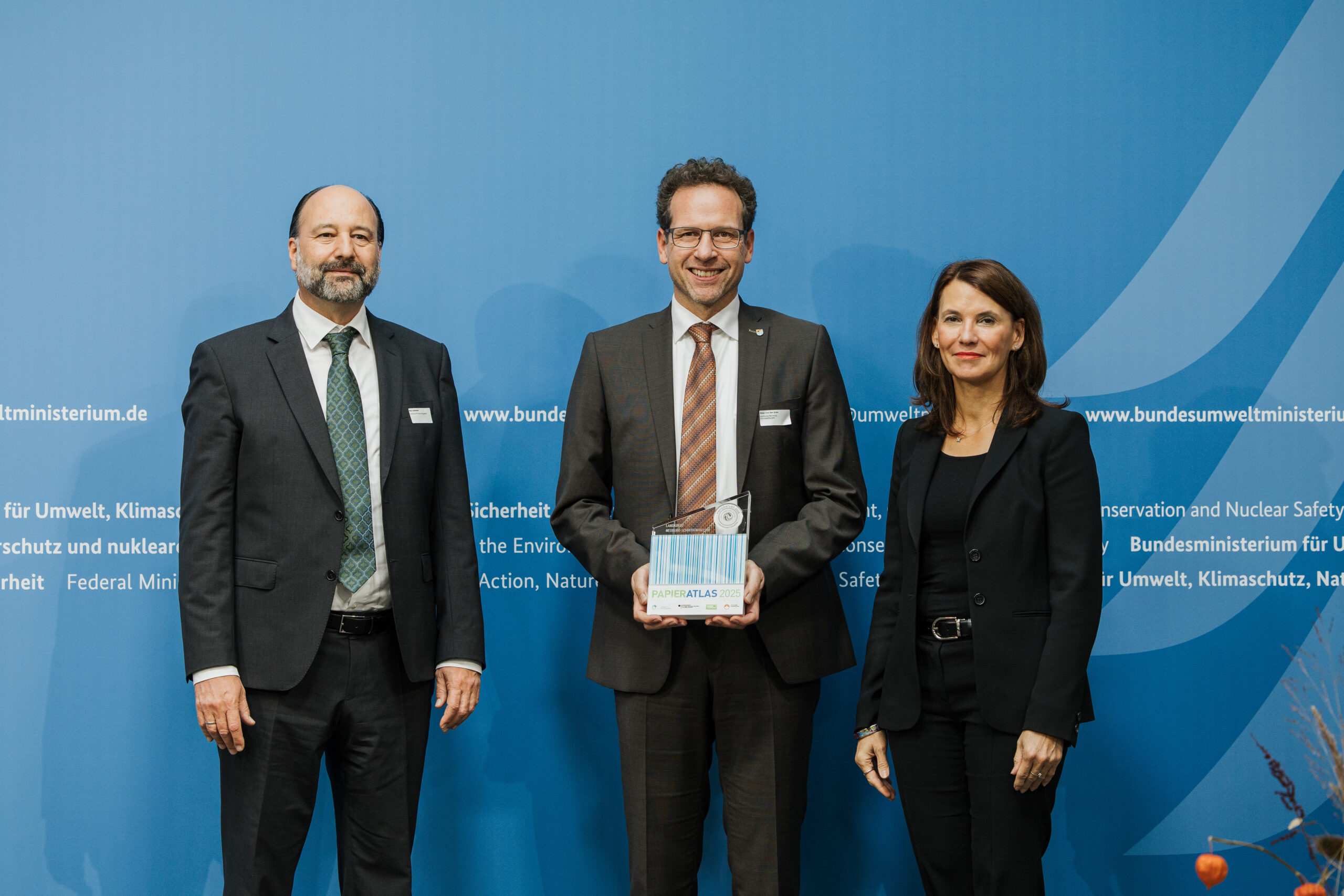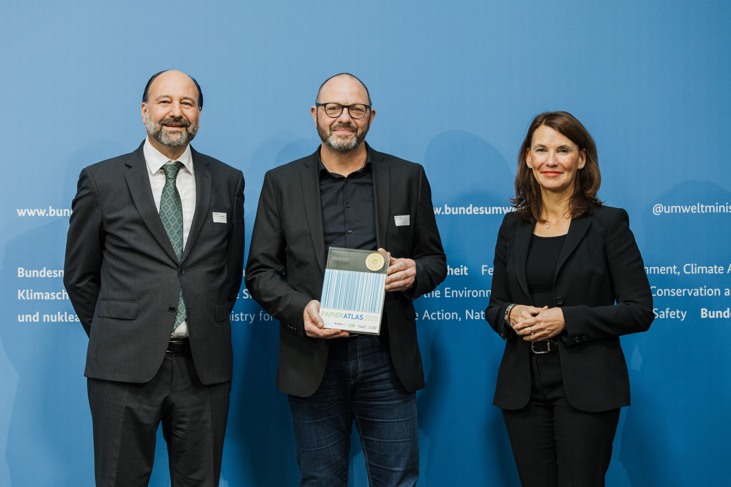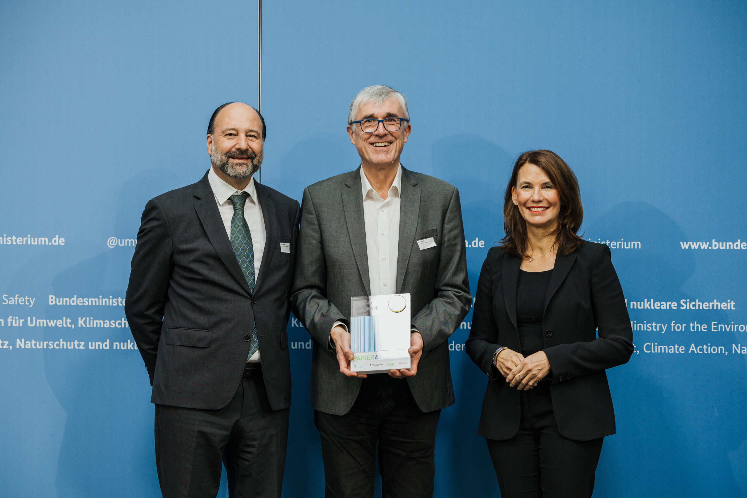 Auszeichnung der Stadt Freiburg als „Mehrfachsieger“, v.l.n.r.: Marc Gebauer (Sprecher der Initiative Pro Recyclingpapier), Roland Meder (Amtsleiter Haupt- und Personalamt der Stadt Freiburg), Parlamentarische Staatssekretärin Rita Schwarzelühr-Sutter © BMUKN/Sascha Hilgers