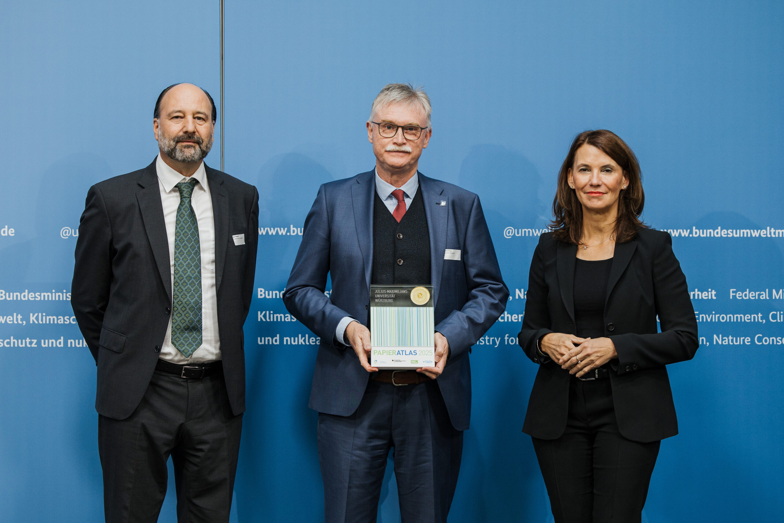 Auszeichnung Universität Würzburg als „Recyclingpapierfreundlichste Hochschule“ 2025, v.l.n.r.: Marc Gebauer (Sprecher der Initiative Pro Recyclingpapier), Dr. Uwe Klug (Kanzler der Universität Würzburg), Parlamentarische Staatssekretärin Rita Schwarzelühr-Sutter © BMUKN/Sascha Hilgers